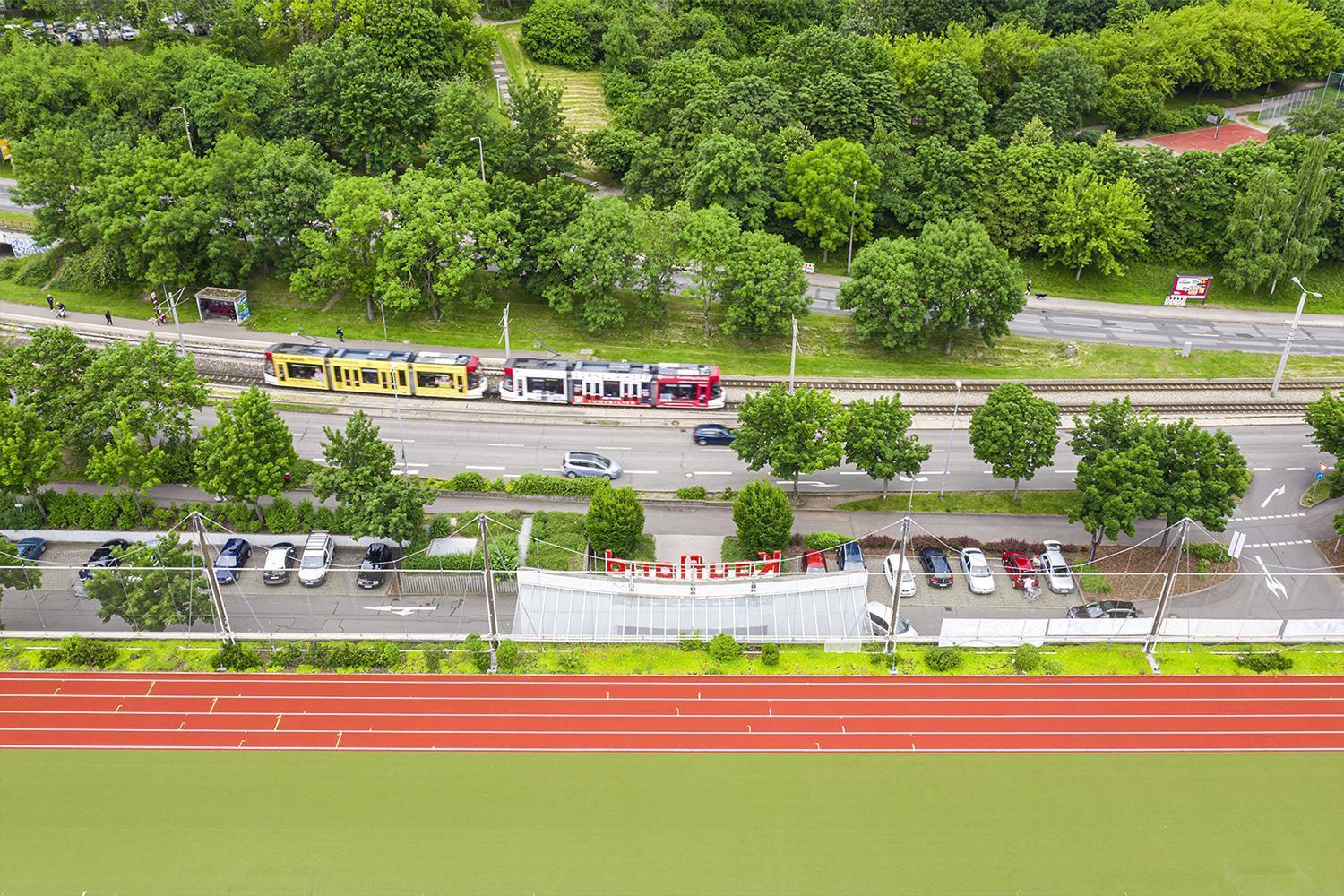 The Kaufland sports roof has a large artificial turf playing field (73 x 110 metres), a four-lane, 400-metre running track with six straight sprint lanes, long jump, high jump and triple jump facilities, as well as two volleyball courts. It also includes a spectator stand with sweeping views over the whole city and a building to house changing rooms for athletes, judges, teachers and coaches as well as equipment rooms. The Kaufland sports roof is thus a fully equipped type C athletics facility - and its spectacular location and view makes it one of the most frequented sports facilities in the entire city.
