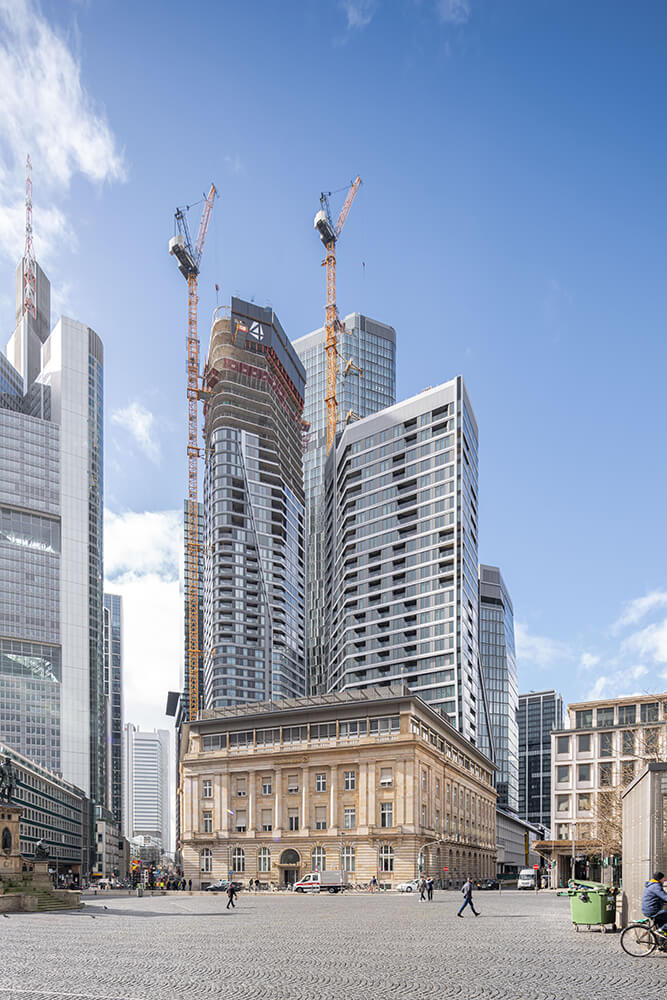The Deutsche Bank Triangle, also known as FOUR Frankfurt, is a major property project in the heart of Frankfurt am Main. The project comprises the construction of four striking high-rise buildings that will significantly shape the cityscape of Frankfurt with heights of 233, 179, 128 and 104 metres. The tallest tower will be Germany's third tallest building and will also offer the highest usable floor in the city of Frankfurt. Deutsche Bank, one of the largest banks in Germany, is the initiator of this ambitious construction project. The four high-rise buildings that give this project its name are part of a larger urban development concept aimed at renewing and enriching Frankfurt's skyline. In addition to the high-rise buildings, the project also includes public squares and roof terraces, green spaces and facilities to improve the quality of life in the neighbourhood.