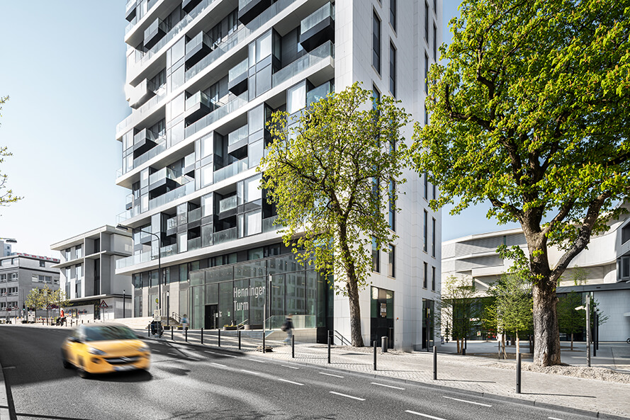 The new Henninger Tower with a height of 140 metres was built on the same site between 2014 and 2017. The architecture is structurally based on the original. The new tower is a residential tower with 209 luxury flats. On the top floor there is a restaurant and a publicly accessible visitors' terrace from which you can look out over the Frankfurt skyline.